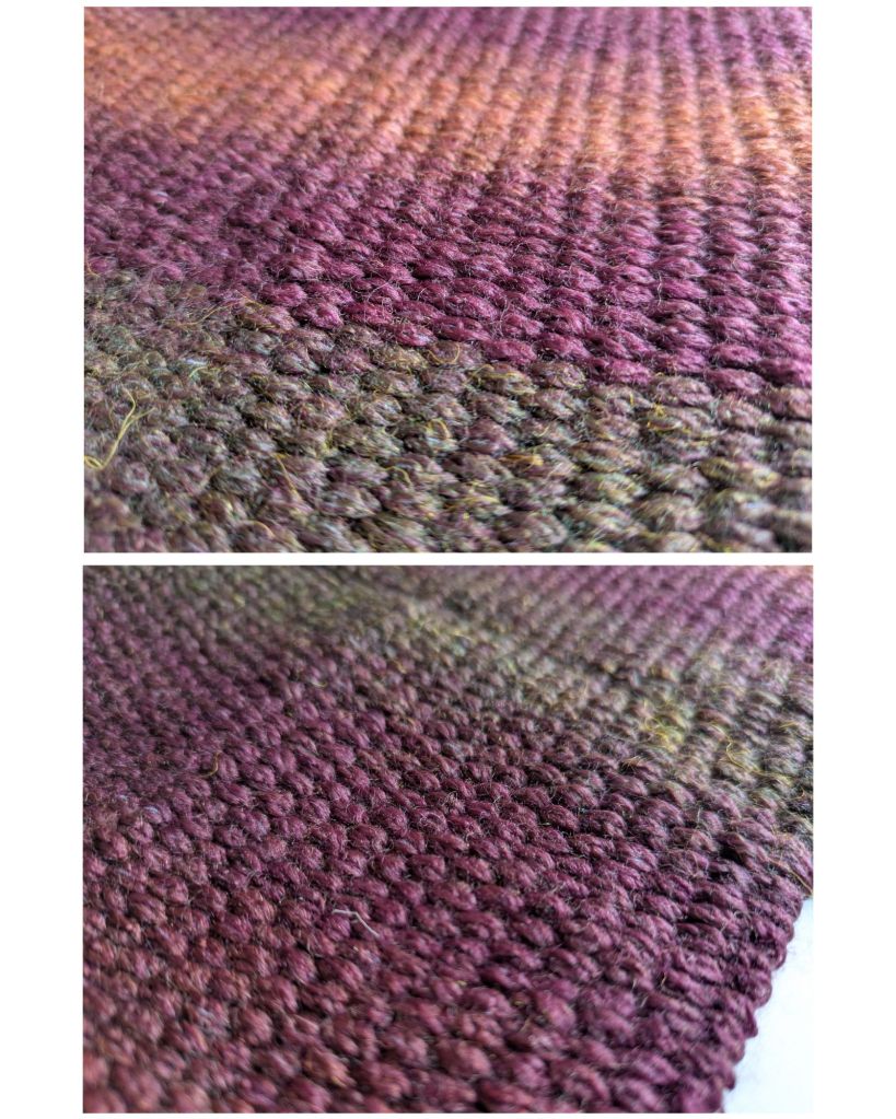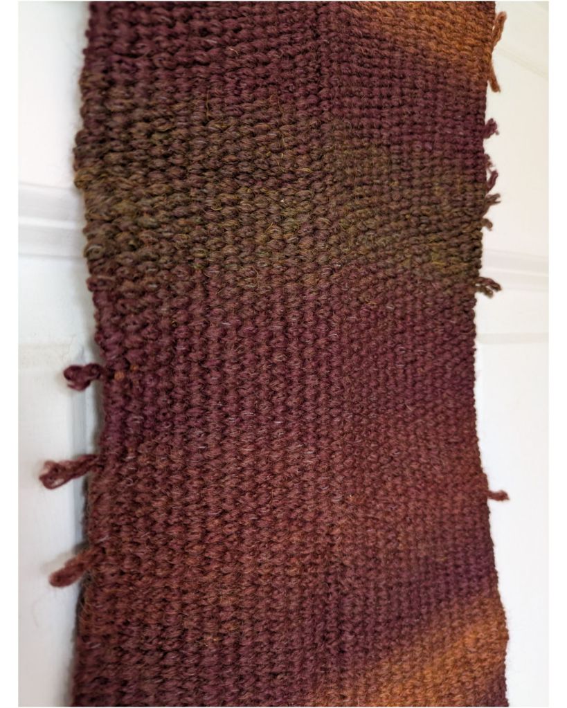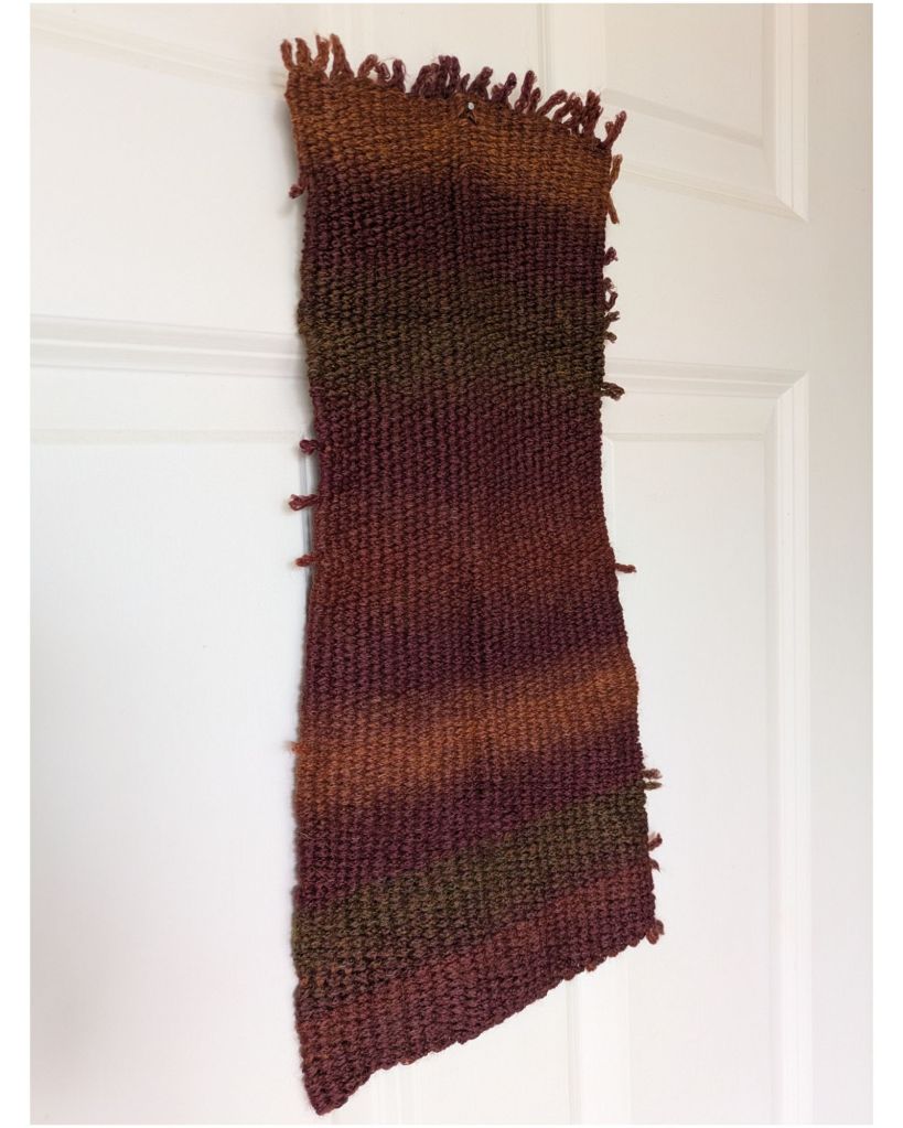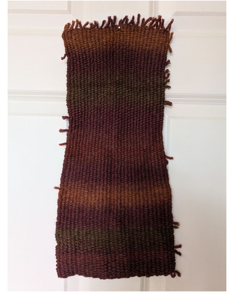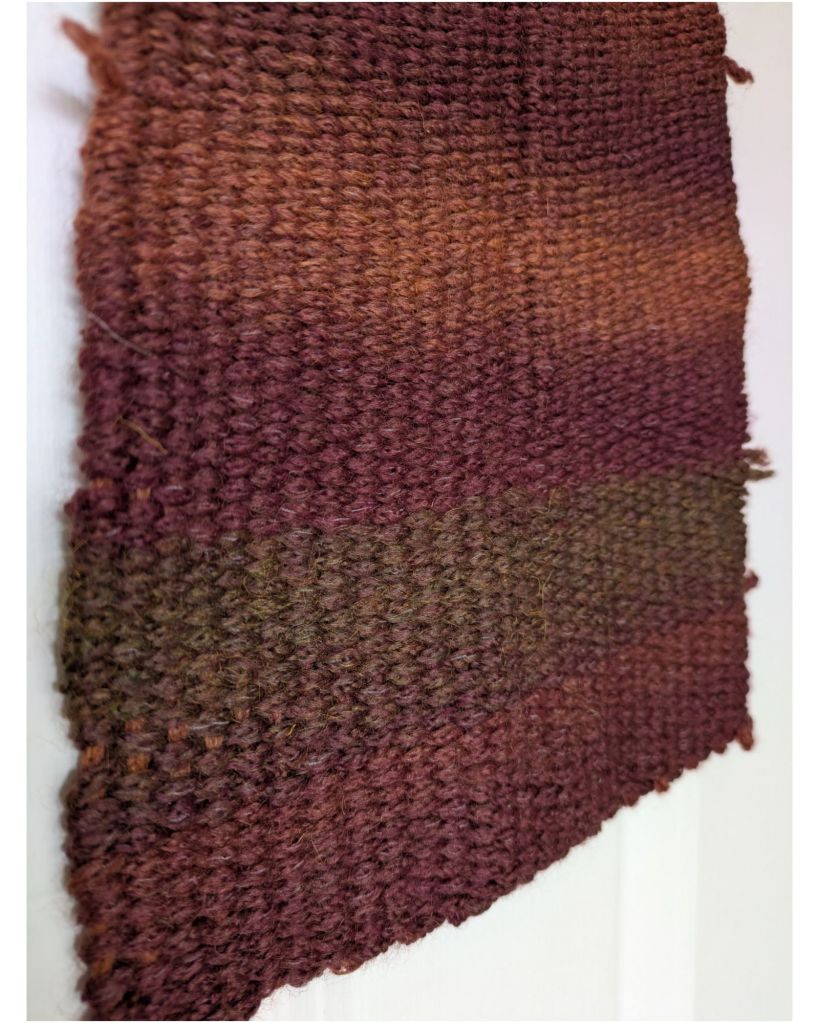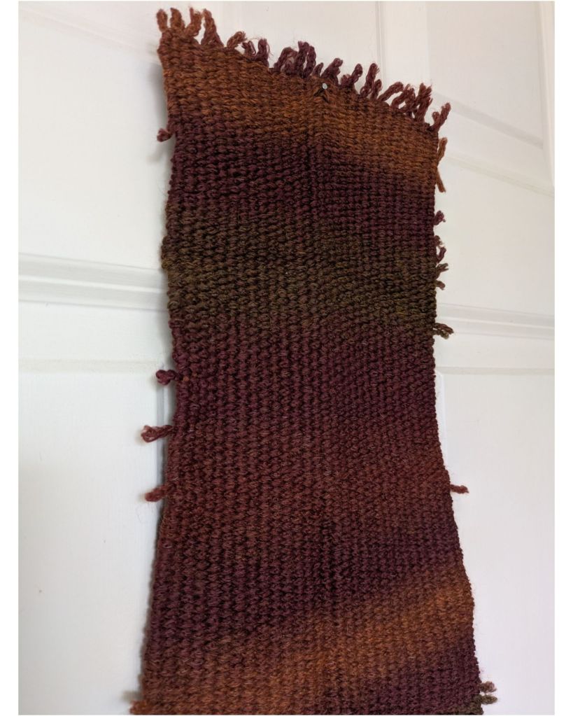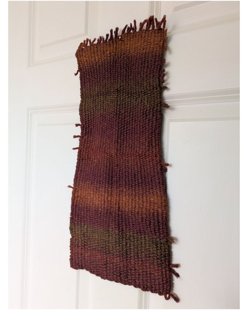 This is a piece of fabric I made in 2013. It is hand-woven from this beautiful variegated wool that I found in the haberdashery on the top floor of House of Fraser in Birmingham City Centre. It was crafted on a cardboard loom, which I also cut myself. I remembered the technique from an afternoon of weaving with paper and fabric scraps in Year 3.